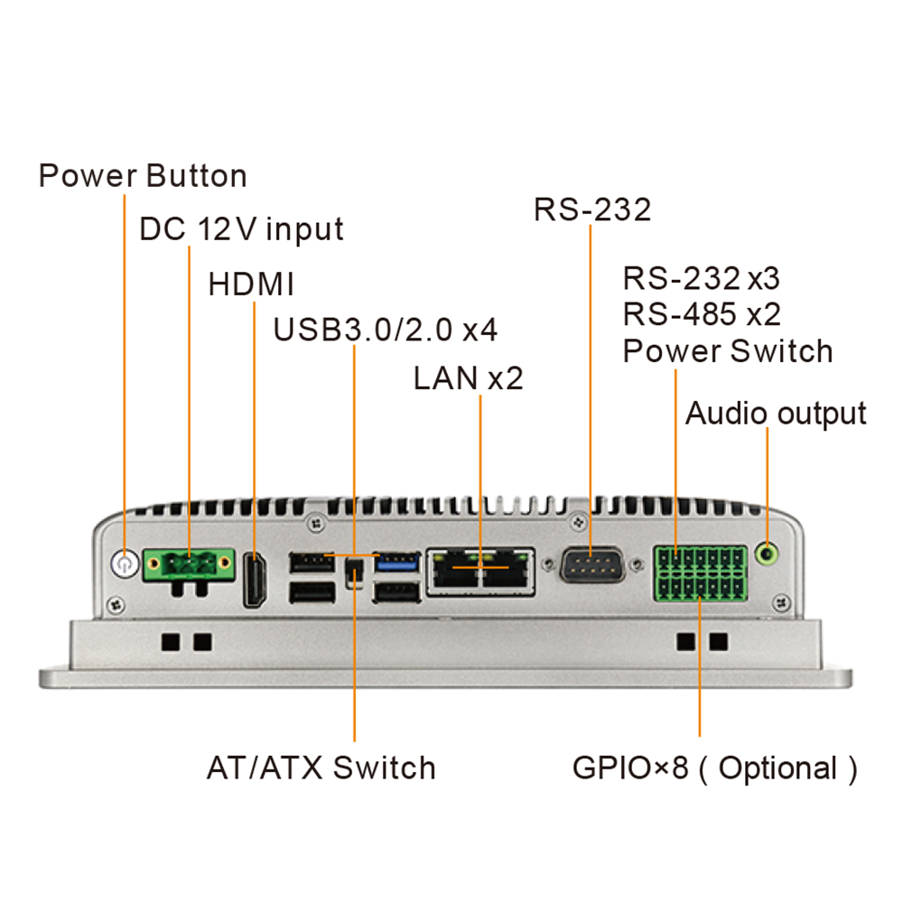 I/0 interface3xUSB2.0,1xUSB3.0 1 x DB-9 COM1 RS-232 3 x3-wire COM2&COM3&COM4,RS-232 Phoenix terminal 2 x3-wire COM5&COM6 RS-485 Phoenix terminal 1 x Audio Line-out 2x8Ω1W amplifier output (optional) 1 xAT/ATX dip switch 1 xHDMI 1 x8 bit GPl0 (optional)
